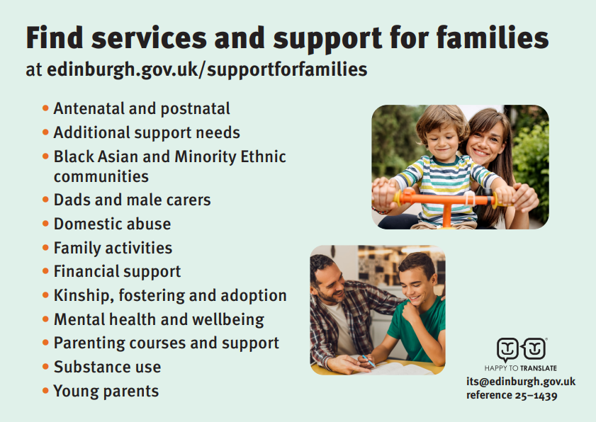 If you are struggling to find the right services or supports, please email supportingparentsandcarers@edinburgh.gov.uk and one of their Parent and Carer Support Development Officers will be able to assist.